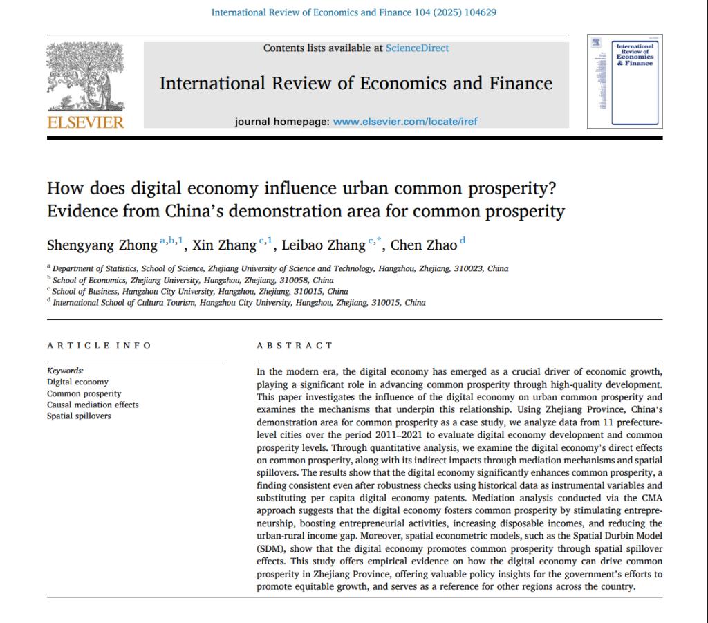 近日,应用统计与金融数学团队钟声扬博士与合作者在经济/金融领域权威期刊《International Review of Economics and Finance》上发表了题为“How does digital economy influence urban common prosperity? Evidence from China’s demonstration area for common prosperity”的研究论文。此论文钟声扬博士为第一作者,yl23411永利官网登录为第一完成单位,浙江大学为第二单位。