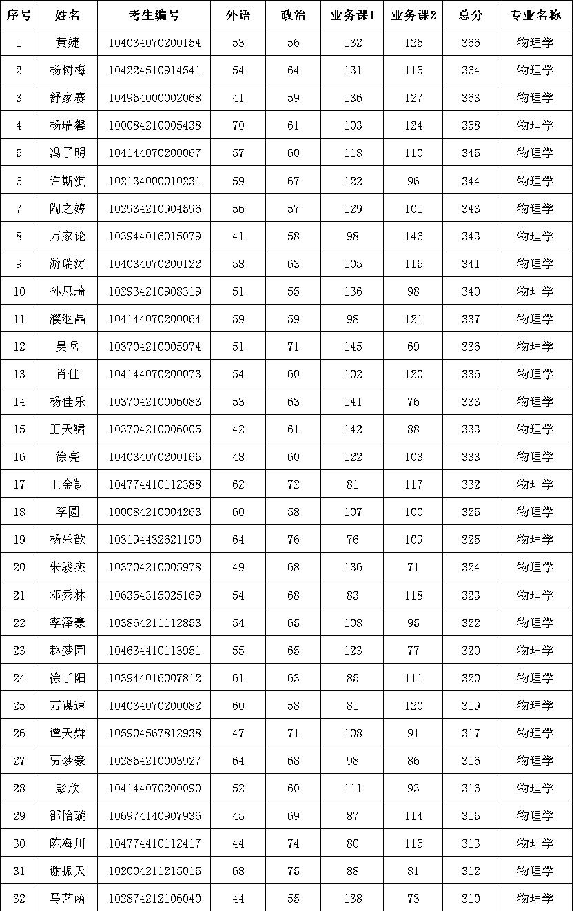 根据《2024年硕士研究生招生复试录取工作实施细则》中物理学调剂的基本要求,及复试比例1:1.5的差额,按照初试总分由高到低的原则,复试面试名单如下: