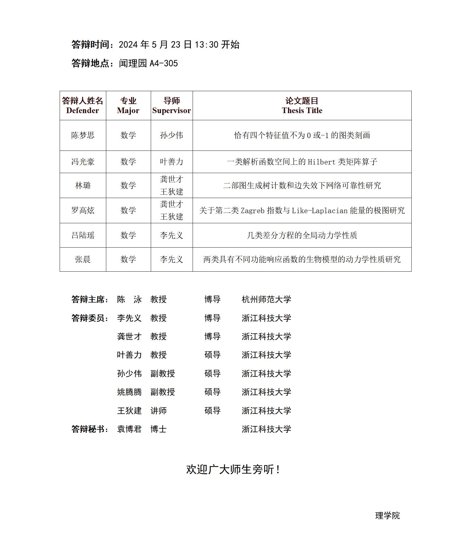 2024年yl23411永利官网登录硕士研究生学位论文答辩公告(数学1组)