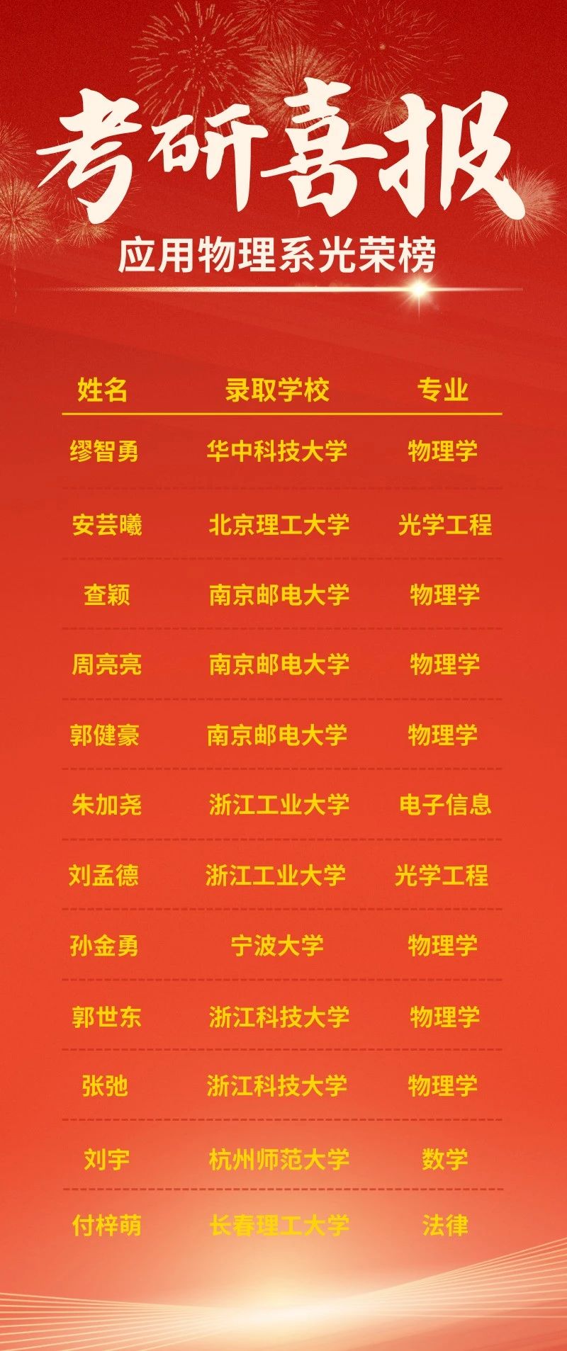 杏坛吐馥结硕果,兰台振翼报佳音。在2025年全国硕士研究生招考中,yl23411永利官网登录应用物理系共计12位学子被华中科技大学、北京理工大学、南京邮电大学、浙江工业大学等高校成功录取。(文稿来源:浙科物理)