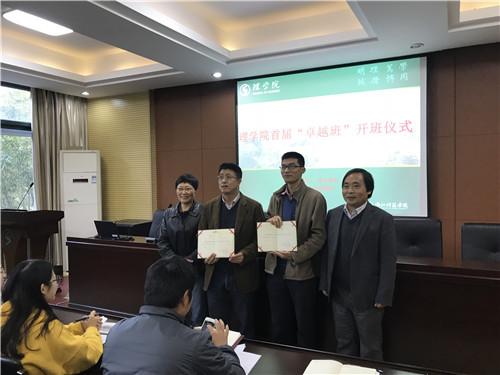 会上,陶祥兴做动员讲话。他要求“卓越班”成员要坚定学习目标,端正学习态度,从被动学习到主动学习;要改进学习方法,学会探索和创新。同时对同学们提出了三点希望:一要百尺竿头,更进一步;二要笃行不倦,善作善成; 三要志存高远,扬帆理学新时代。随后,苗红亚为首届“卓越班”班主任:公司党委委员、经理助理骆钧炎教授和信计系主任龚世才教授颁发聘书。两位班主任分别对“卓越班”学子提出了要求与希望,并对“卓越班”具体培养计划作出说明。信息与计算科学162班戴宁同学代表全体“卓越班”成员进行了发言和宣誓。最后,苗红亚做总结发言,她希望“卓越班”学子树立目标、珍惜机会、努力学习,用自己的行动去影响和带动身边的同学,为实现大学梦、理学梦砥砺前行。