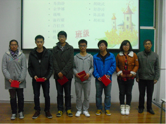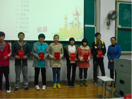 图为系主任朱婉珍为信计专业期中考试前9名(121班:周婷婷,钱佳颖,谢程耀,许佳燕,林倩倩,122班:苏勤静,123班:余梦娜,戴唯,蒋燕婷)同学颁奖