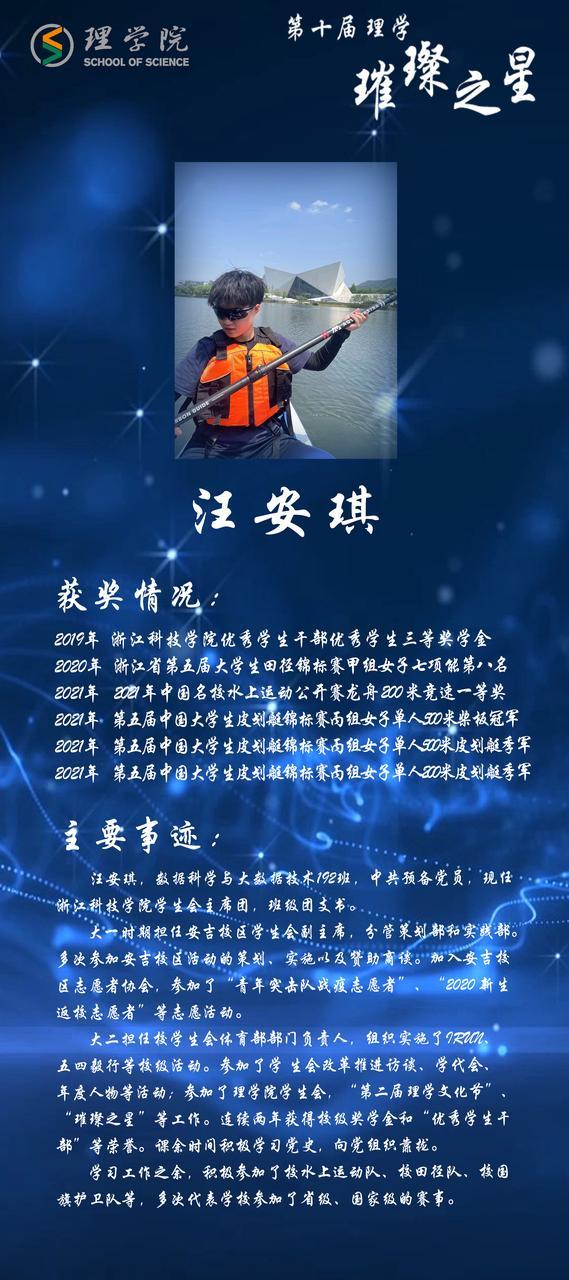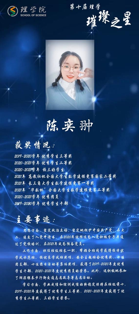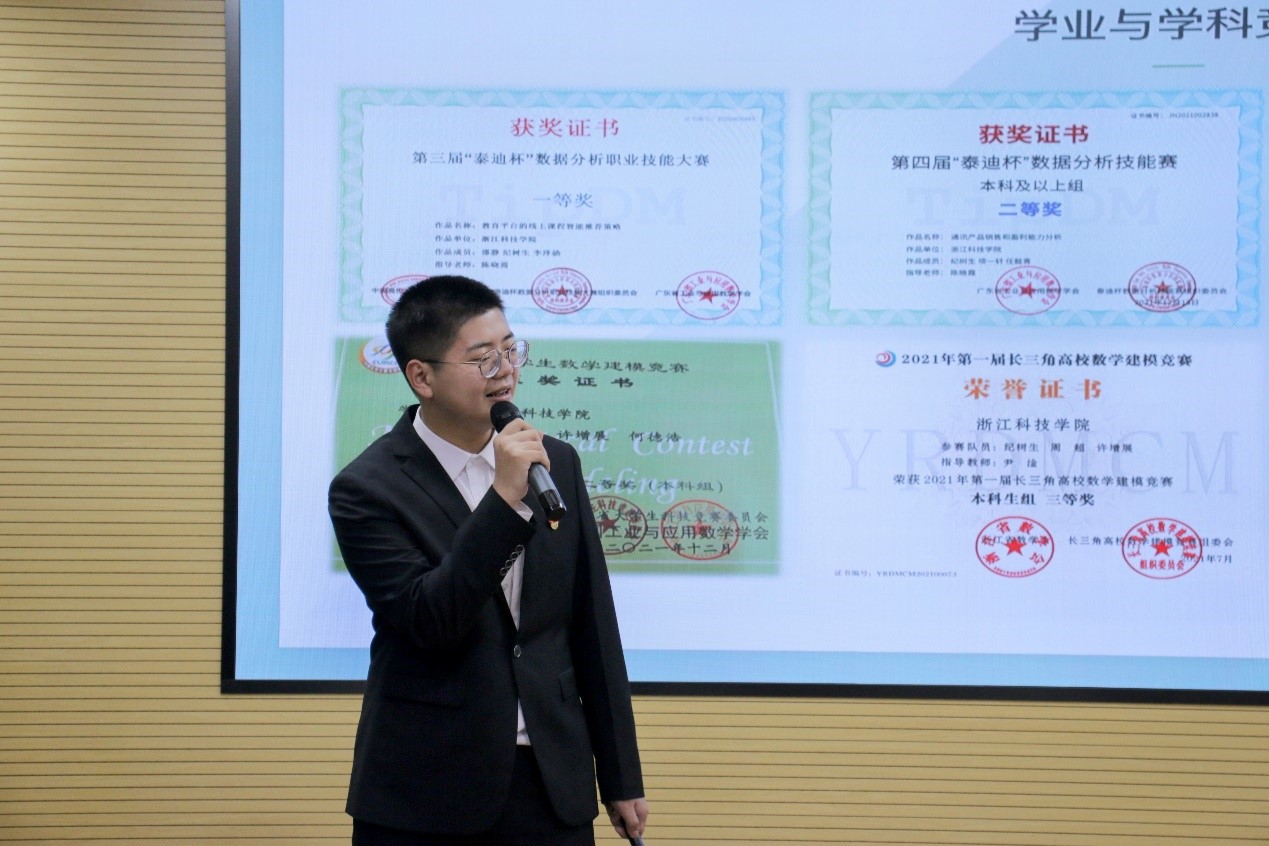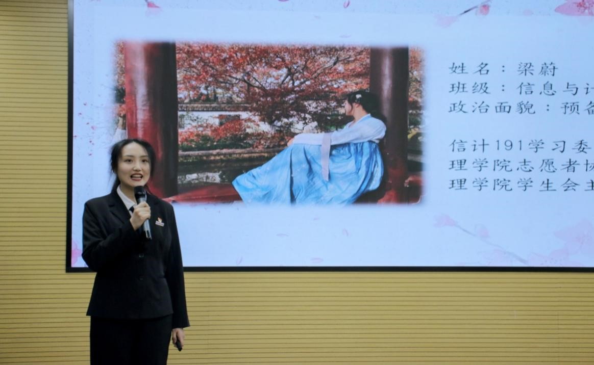 随后,璀璨之星们开始个人风采展示。信息与计算科学191班的班长陈奕翀从学习生活和班团工作出发,分享她的带领班级斩获各项荣誉的故事。数据科学与大数据技术(中法班)191班陆文婷创立了多项创新项目和发明专利,她讲述了她的科研成果和竞赛之旅。信息与计算科学191班梁蔚始终牢记党的教诲,用实际行动诠释了责任与担当,她分享了她与各类志愿活动、团学工作的故事。信息与计算科学191班史琦,她的思政微课发布在各大官方媒体上,且勇攀各科高峰,囊括学业、社会实践、团学工作、科技竞赛各类奖项。数据科学与大数据技术191班林欣颖,踏实学习,勤恳工作,获多项竞赛奖项,积极参与各种志愿活动,并通过yl23411永利官网登录新媒体的舞台,致力于yl23411永利官网登录的宣传工作。数据科学与大数据技术(中法班)192班卢奕霖热爱舞蹈,获多项舞蹈奖项;勤奋学习,获奖学金,多种竞赛奖项等。数据科学与大数据技术191班纪树生担任班长、院团委组织委员、院员工会活动部负责人等多种职责,分享了他在学科竞赛道路上的成长之旅。应用物理191班研究生吴白瑞,发表多篇论文、拥有多项专利,他分享了他的科研道路。数据科学与大数据技术201班九折团队,拥有着“纸折九次,并非不可”勇于突破的探索精神,分享了他们获全国老员工数模竞赛一等奖的经验。数据科学与大数据技术192班汪安琪,凭借着自我管理和毅力,参与了多项体育赛事并获奖,特别是中国老员工皮划艇锦标赛冠军。