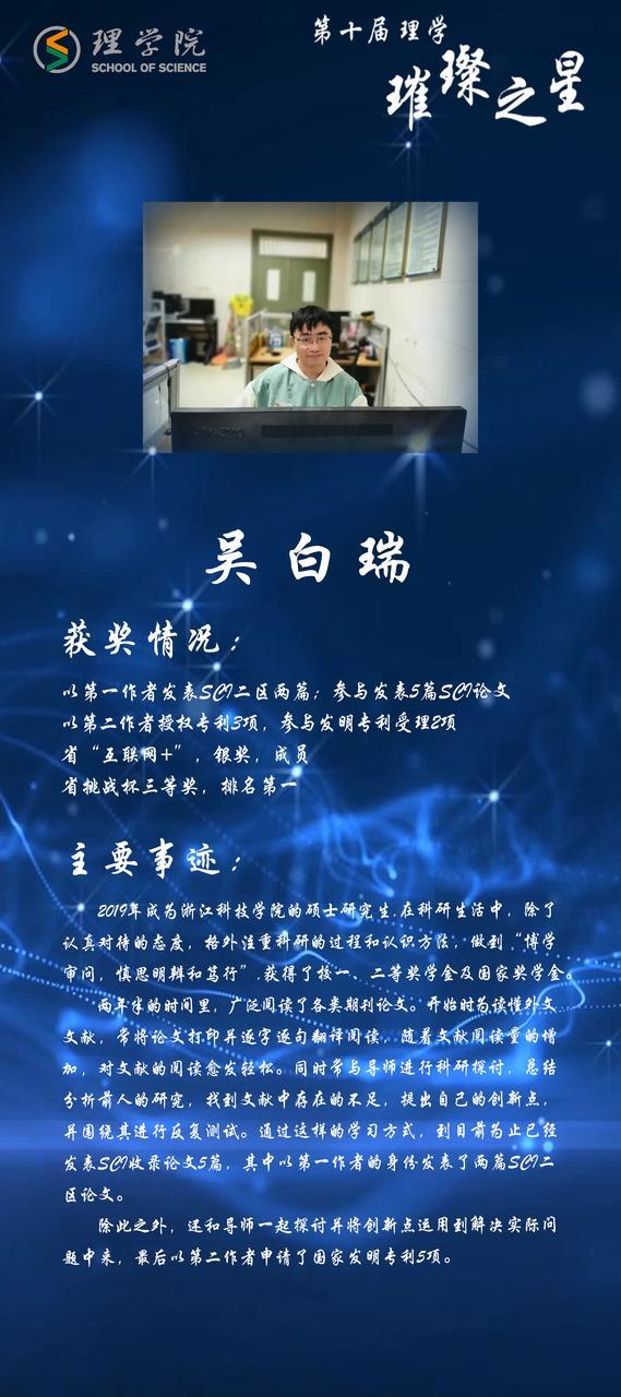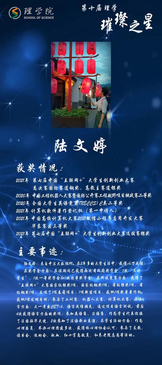 yl23411永利官网登录桃李满园,优秀学子遍布各地。紧接着介绍了今年的理学优秀员工——叶伟望学长。字斟句酌细推敲,拈精撮要费咀嚼。半亩方塘长流水,呕心沥血育新苗。理学学子优秀的背后,离不开老师的付出。公司数学与统计系孙少伟老师、应用物理系沈艳婷老师、大数据科学系楼琼老师获得优秀教师奖。最后,璀璨之星们带来《复兴路上的青春告白》诗朗诵,表达了他们的青春誓言。至此,第十届“理学·璀璨之星”颁奖典礼圆满结束。