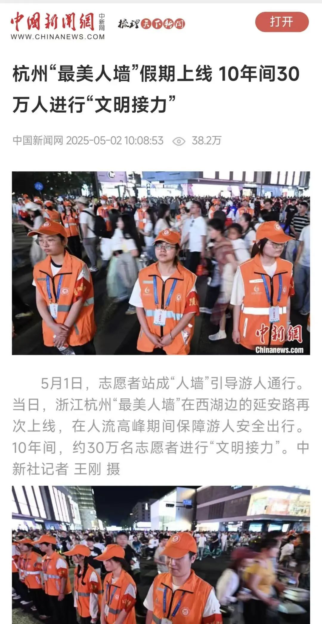 5月1日-5月5日,在延安路和平海路的交叉路口,五一湖滨“最美人墙”上线!志愿者们手拉手,随着红绿灯变化组成不同队形。绿灯亮时,他们站成双V形,引导行人顺利通过;红灯快亮时,又迅速延伸人墙,护送还在路中间的行人安全走到对面。