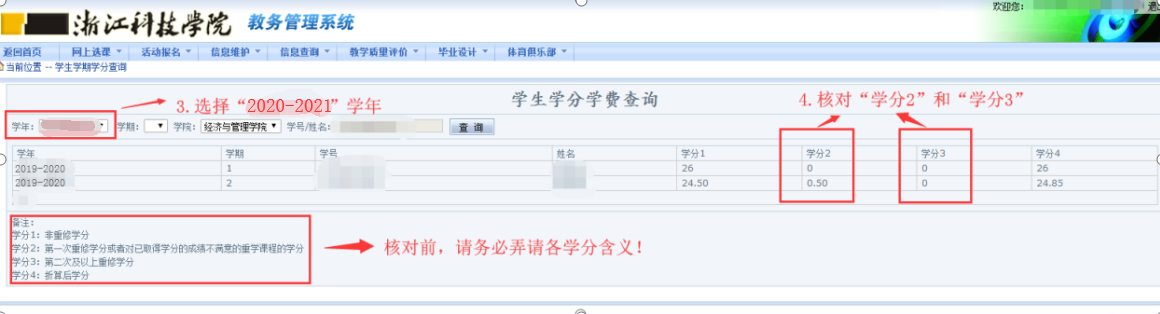 核对内容:2020-2021学年1学期和2学期的学分2和学分3。(其他学年学期本次不核对、不缴费)