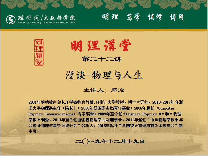 12月19日下午,应用物理系有幸邀请了浙江大学物理系主任(经理)郑波教授来公司给大一学子做了题为“漫谈-物理与人生”的精彩讲座。郑波教授2001年获聘教育部长江学者特聘教授,任浙江大学教授、博士生导师,2010-2017年任浙江大学物理系主任(经理),2003年获国家杰出青年基金。2006年起任 <Computer Physics Communications> 专家编辑,2009年至今任《Chinese Physics B》和《物理学报》编委。2013年至今任浙江省物理学会副理事长。2011年起任“中国物理学秋季年会统计物理与复杂系统分会”召集人,2015年起任“全国统计物理与复杂系统年会”副主席。研究方向主要包括非平衡态统计物理、计算机模拟物理、金融物理和复杂动力学系统。共发表国际SCI刊物论文120余篇,论文的被引用总数3000余篇次。