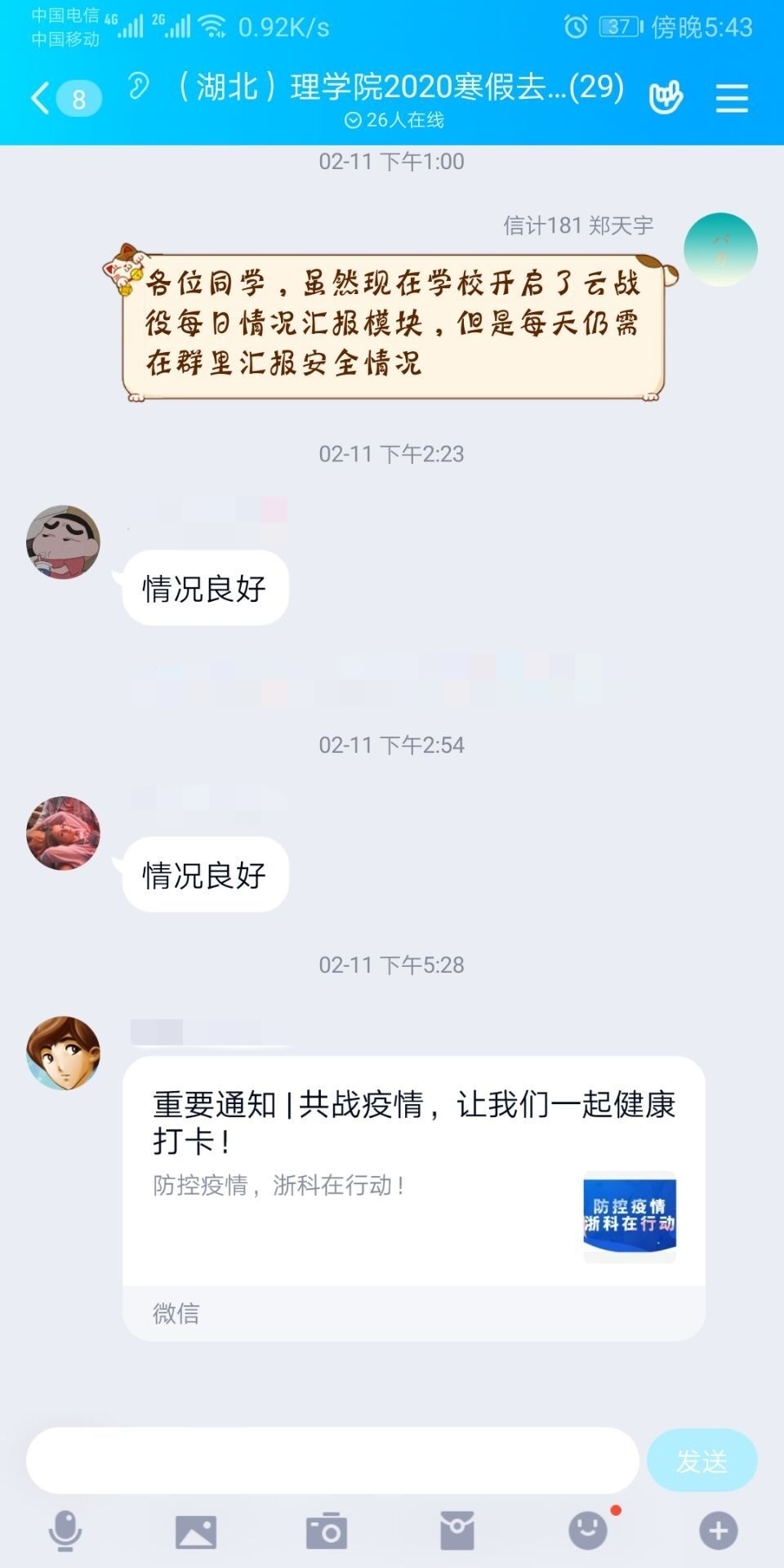 身为浙科院的一名入党积极分子,同时作为一名身处疫区的湖北人,我对着突如其来的一切都感到始料未及。但在看到国家迅速采取行动,积极应对时,我也意识到我身上肩负的责任。由于行程原因,在湖北封锁前,我回到了老家(仍在湖北)。防疫抗疫工作开始,我们全家自行封户,主动隔离,每天实时关注疫情消息。同时积极配合公司疫情排摸工作,每日按时打卡,如实及时汇报个人健康状况。