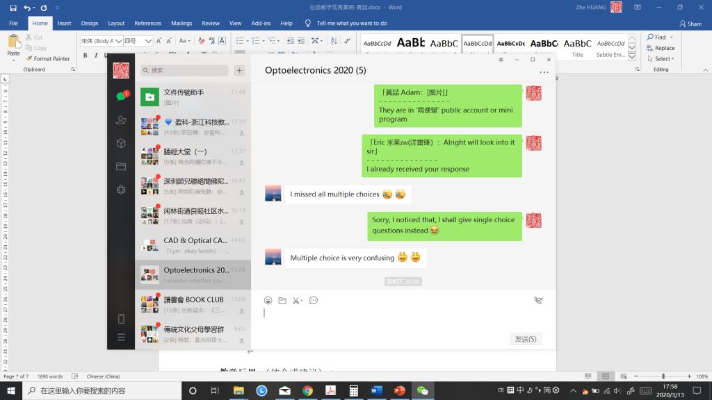 我自己的体会是上好一堂课,关心好不在一个地方尤其远在海外的员工很不容易。开始我在寒假初期花了很多时间学习和研究了“对分”教育理念和BOPPPS有效教学法理论,后期钻研各种线上教学的平台、技术工具(雨课堂、智慧树、中国老员工MOOC、QQ群视频/直播、zoom、钉钉直播/群视频、Blackboard等)。经过一周多的教学实践,感觉目前上课的技术比较熟练运用起来。但是逐渐在课堂和课下发现如何挖掘好员工的学习积极性和专注力的问题,需要我在以下方面进一步努力:进一步精简线上直播课堂内容和难度,注重线上、线下员工自学和引导员工间分享讨论全过程的教学。