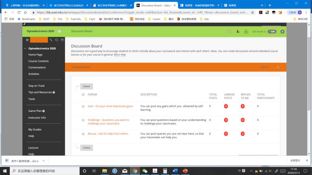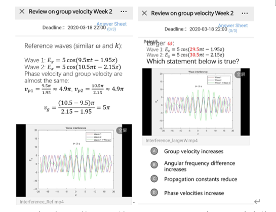 由于员工在线下自学时对某些比较难理解的概念可能(例如本课程开始的波阵面、群速度等)有疑问或者有学到新的内容,我参照“对分”教学中的“亮考帮”作业(“亮”:亮闪闪,员工通过自学明白的最大得意;“考”:员工自学时搞清楚的概念可以设置问题考考其他同学;“帮”:员工自学后不能解决的问题,需要其他同学帮忙),设置“亮考帮”三类讨论区论坛(‘Gain-Challenge-Rescue’Forums):