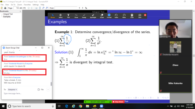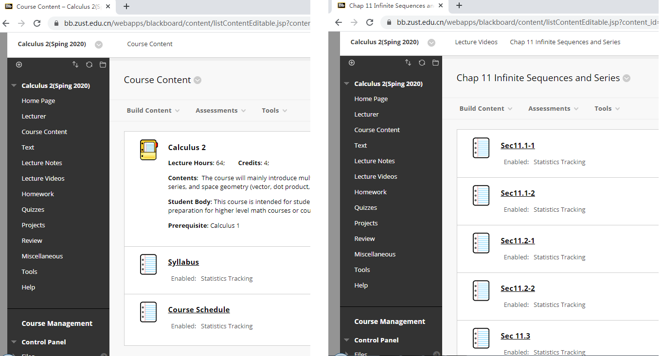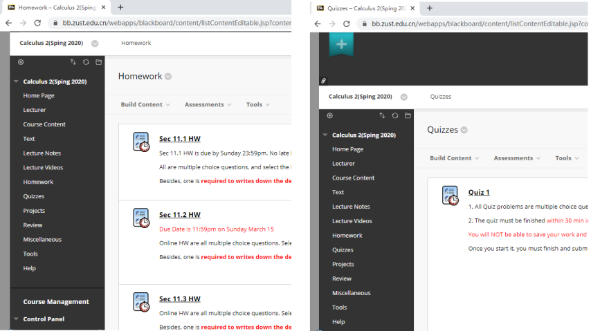在教师方面, Calculus 2的课,我用的是Blackboard平台. 平台本身不错, 但是校园网的防火墙极度粗糙的过滤方式, 严重影响师生正常工作、学习(尤其是开学第一、二周问题最严重). 经常出现的情况是,我在正常更新课程网站,突然校园网把我屏蔽了;我在正常改员工线上作业,输入评论,校园网把我屏蔽了;我在上传课程视频,校园网把我屏蔽了;有的国际员工想要登陆平台做作业,校园网把他屏蔽了…….对此问题, 向公司反映过多次(比如, 集团第一周网课的调查反馈表,我填了2次,反映这个问题);教务处的贾瑾老师,还有Blackboard的客服肖禾佳,都非常负责,给了我很多帮助.