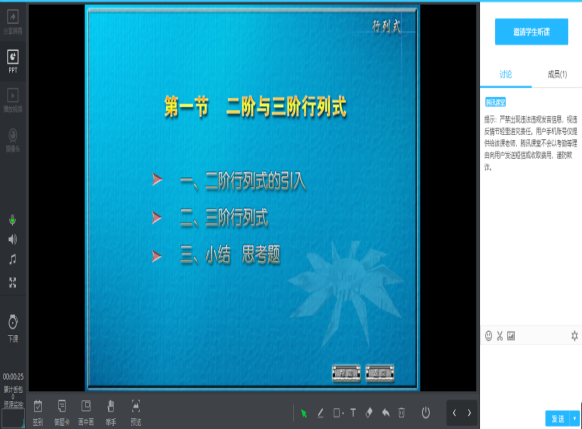 Ø 课中:主要采用腾讯课堂直播功能进行课堂直播教学。腾讯课堂支持在线即时互动教学,提供流畅、高音质的课程直播效果;支持PPT演示,白板书写、屏幕分享,画中画、视频播放等多样化的授课模式。同时支持游客模式,便于督导组随时听课。我会在直播授课过程中,穿插提问,而员工会在右侧的对话框文字互动,或使用举手功能上台语音回答问题。为了避免教学过于枯燥,我还会在课间播放音乐让员工轻松一下。