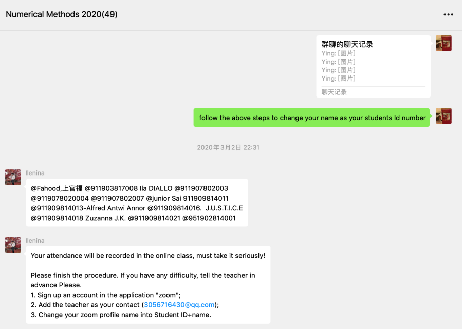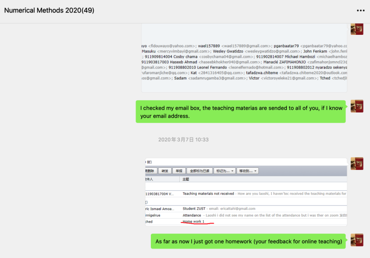 为了3月2日开始的线上教学有序更有效的开展,本人在2月4日左右开始思考和学习如何开展“线上教学”这一自身从未经历过的教学形式。想到要如何把素未蒙面的涉及6个公司8个专业的48位研究生职工召集起来进行线上教学,心中很是忐忑。在充分考虑了授课员工群体的特殊性(职工、语言、时差、网络等),同时学习、试用、比对钉钉、ZOOM、QQ等直播平台,利用互联网搜索学习香港、新加坡等地员工的授课方式,于2月15日初步决定采用ZOOM+微信+百度网盘的方式展开非常时刻的教学工作。幸运的是在公司留管中心(如Ilenina Yao老师等)和yl23411永利官网登录职工教务(如潘贺、朱凡老师等)的热心及时的帮助下,忐忑的心有所放下。因为于2月19日开始,利用10天左右的时间通过微信群成功地联系到了班上的46名员工,同时将37名员工顺利迁移到了ZOOM教学平台,对于没有联系到的2位员工和没有迁移到ZOOM平台的员工,在留管中心老师的帮助下,搞清楚了原因(已办理退学5名,4名回国网络差无法用ZOOM)。于2月24日开始直至3月3日(第一次课的前一天),通过微信群,指导员工如何利用ZOOM进行在线上课、反复告知员工上课的时间等。以争取最大限度地线上教学硬件资源的充分准备。