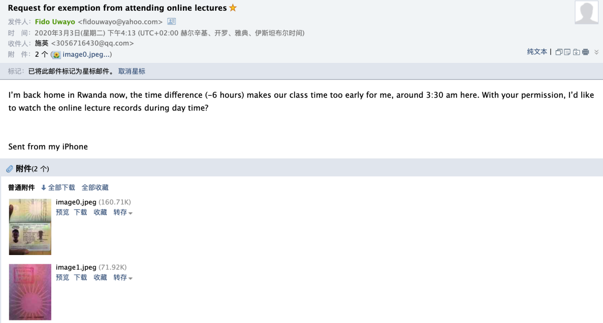 非洲、东欧国家的员工,比北京时间晚几个小时,比如本课程是建议员工北京时间9:30开始进入ZOOM教室,9:50正式上课,但是对于有些国家的员工是凌晨(比如,课上员工学号911907802004姓名ATTAHI ERIC ISMAEL AMOAKON 专业INTELLIGENT MANUFACTURING CONTROL ENGINEERING 所在城市科特迪瓦,阿比让市,上课是当地时间凌晨1:30)。教师需站在员工角度,通过录播的视频,课件资料等鼓励员工在无法进行线上授课的情况下进行线下自学,多与教师积极沟通。因时差问题,员工本人通过提高其出入境证明已经向教师申请不进行线上授课,通过教师给其发送教学资料(包括课件、录播的视频、ZOOM自带的视频会议录播视频等、作业答案、随堂测试答案等)。