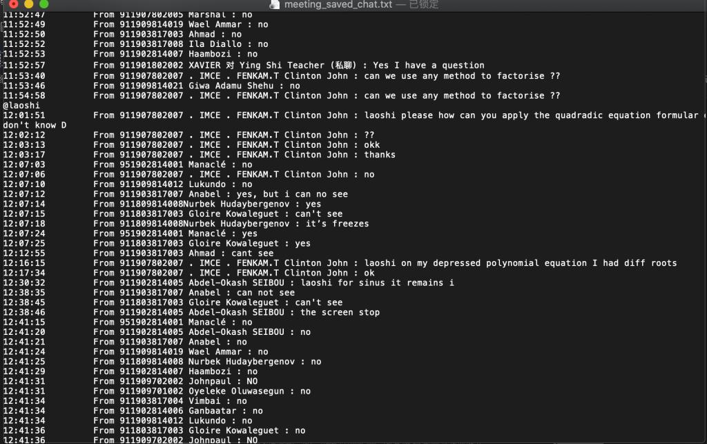 线上教学,所谓知己知彼,就是教师利用自己的另一个ZOOM账号加入在线ZOOM教室,以便实时监测在线教学过程中语音、屏幕共享等是否流畅无暇。线上教学,在知识点的讲解之后,必然要紧随知识点的测试,测试的方式有三种:一在线点名某位员工进行回答,进行屏幕共享;二给员工10-15分钟时间进行解答,然后通过Email在教师规定的时间内上交;三对于简单的问题,要求员工在聊天窗口中进行解答“Yes or No”。以此来实现最大限度的实时互动。下图是ZOOM在上课期间自动保存的聊天窗口的对话内容。教师在直播过程中,可以提问员工,员工的回答可以是简单的Yes或者No。另外,教师直播过程中,将全体员工静音处理了,员工可以利用ZOOM的聊天窗口向老师提问。同时,教师要求员工提问设置为“对所有人”,所以其他员工也可以看到这位员工的问题。这样教师在直播中可以适当放慢节奏,对员工不理解的地方进行进一步详细解释。注:下图是第一次课,考虑到员工适应课堂需要时间,故上课之初教师和员工协商将此次课程延长30分钟,以此提升教学效果,完成此次教学任务。