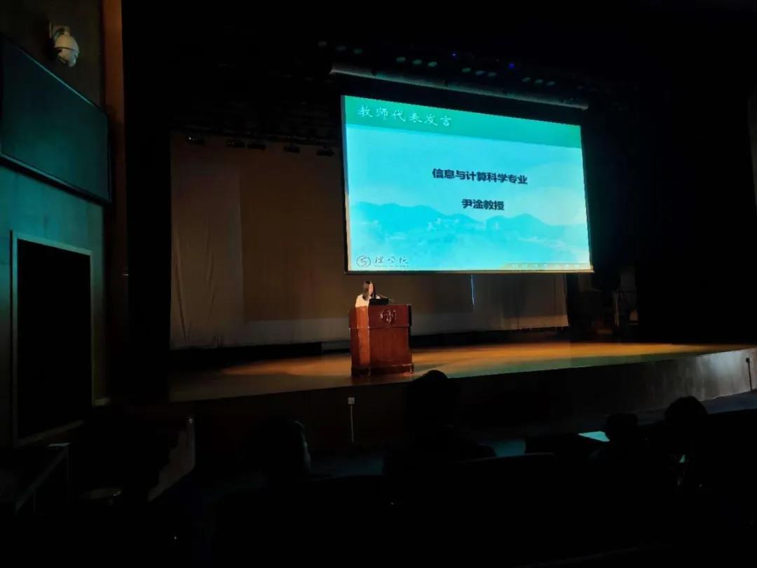 接下来教师代表尹淦教授代表公司全体教师对新生接下来的学习生活提出了要求,建议大家培养自主学习、独立思考、团队协作等能力,并且表示“磨砺是必然存在的”,鼓励新生在学习中要不惧困难,勇往直前。