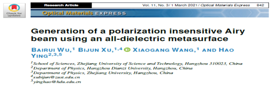 近日,公司应用物理系2019级研究生吴白瑞同学在徐弼军指导下以第一作者身份在美国光学学会旗下的国际知名学术期刊《Optical Materials Express》(影响因子3.064,中科院二区)上发表一篇高质量学术论文,报道了他们在超构表面产生特殊光束的最新研究成果。浙江科技公司为第一署名单位,徐弼军老师为论文通信作者。