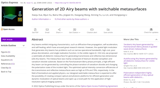近日,由公司徐弼军教授指导的应用物理系2020级研究生薛晓菊同学以第一作者身份在美国光学学会旗下(OSA)著名学术期刊《Optics Express》(影响因子3.894,JCR一区,中科院二区)上发表了题为“Generation of 2D Airy beams with switchable metasurfaces”的研究论文,浙江科技公司为第一署名单位,应用物理系徐弼军和汪小刚分别为论文通讯作者和共同指导教师。