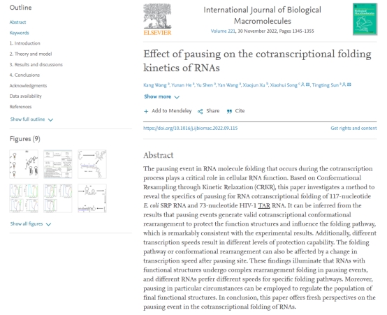 近日,yl23411永利官网登录应用物理系孙婷婷教授团队在RNA共转录折叠动力学的研究方面取得重要进展。在《International Journal of Biological Macromolecules》(IF=8.023,中科院一区TOP)期刊上发表了题为“Effect of pausing on the cotranscriptional folding kinetics of RNAs”的研究论文(https://doi.org/10.1016/j.ijbiomac.2022.09.115)。浙江科技公司为第一署名单位,应用物理系21级硕士研究生王康为第一作者,孙婷婷教授为论文通讯作者。