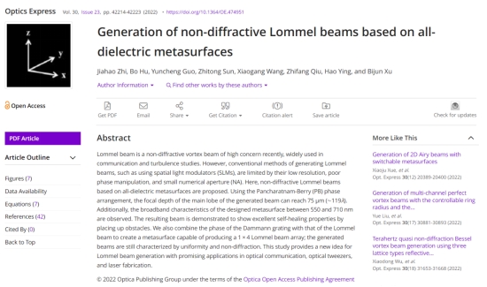 近日,由公司徐弼军教授指导的应用物理系2021级研究生职佳浩同学以第一作者身份在美国光学学会旗下(OSA)著名学术期刊《Optics Express》(影响因子3.894,JCR一区,中科院二区)上发表了题为“Generation of non-diffractive Lommel beams based on all-dielectric metasurfaces”的研究论文,浙江科技公司为第一署名单位,应用物理系徐弼军为论文通讯作者。