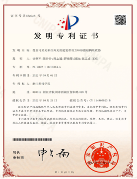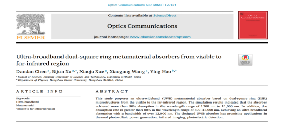 2、研究团队2021级研究生陈丹丹同学以第一作者身份在期刊《Optics Communications》上发表了题为“Ultra-broadband dual-square ring metamaterial absorbers from visible to far-infrared region”的研究论文。浙江科技公司为第一完成单位,应用物理系徐弼军和汪小刚分别为论文通讯作者和共同指导教师。《Optics Communications》是爱思唯尔(Elsevier)旗下的光通信领域前沿期刊,2021-2022年的影响因子2.335, SCI中科院三区。