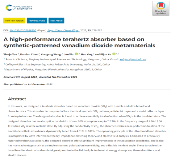 1、研究团队中2020级研究生薛晓菊以第一作者身份在《Physical Chemistry Chemical Physics (PCCP)》 期刊上发表了题为“High-performance terahertz absorber based on synthetic-patterned vanadium dioxide metamaterials”的创新研究文章。浙江科技公司为第一完成单位,应用物理系徐弼军和汪小刚分别为论文通讯作者和共同指导教师。《Physical Chemistry Chemical Physics (PCCP)》是英国皇家化学学会(RSC)旗下著名期刊,2021-2022年的影响因子3.945,中科院分区SCI二区TOP期刊。
