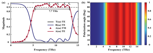 图 (a)超宽带太赫兹吸收器在VO2处于金属态时的透射、反射和吸收光谱。(b)在不同偏振角下的吸收光谱图。