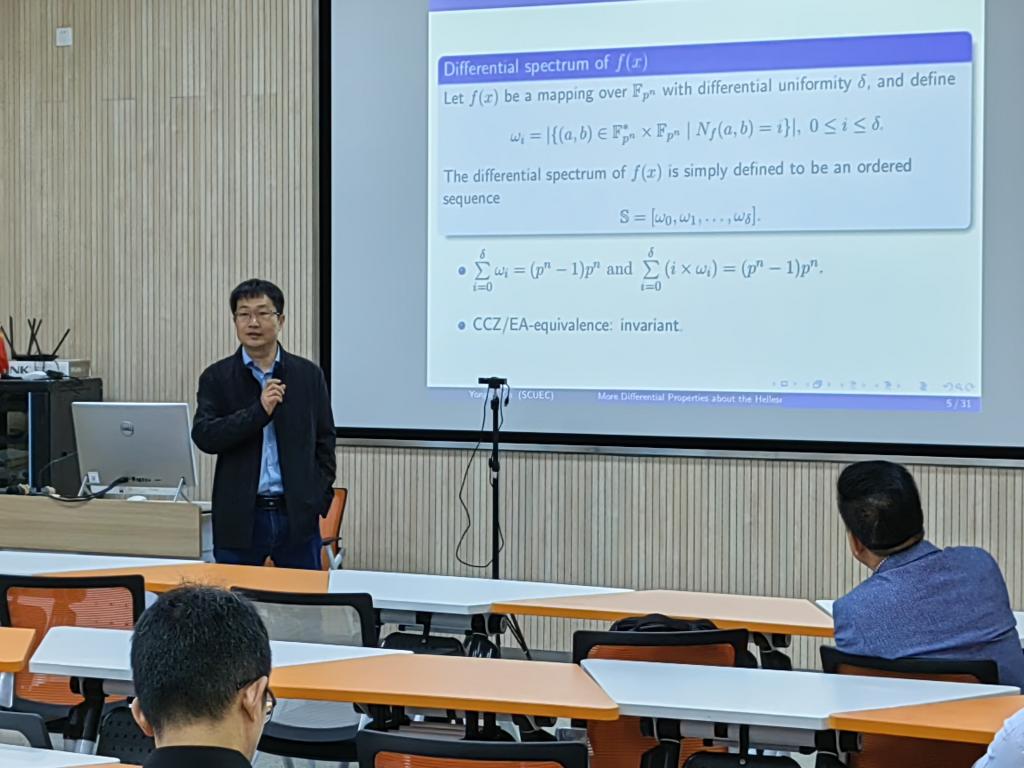 夏永波教授做了题为《Helleseth-Ness函数差分性质的进一步研究》的学术报告,报告中介绍了Helleseth-Ness函数差分的最新研究成果,解决了Ness和Helleseth在2007年提出的一个公开问题。除此之外,还介绍了函数