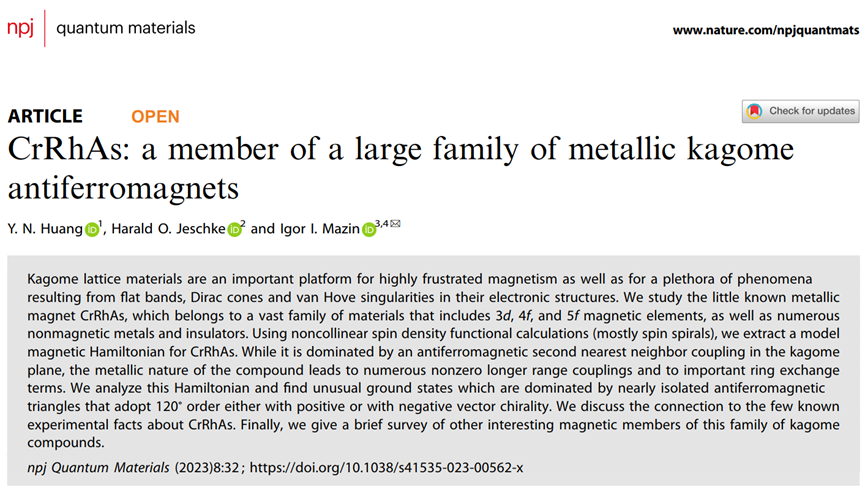 近日,yl23411永利官网登录量子关联物质研究团队黄衣娜老师在“畸变Kagome磁性材料”领域取得重要进展,研究成果以浙江科技公司为第一单位在国际期刊npj quantum materials(影响因子6.856,中科院分区二区)在线发表了题为“CrRhAs: a member of a large family of metallic Kagome antiferromagnets”的论文(链接:https://www.nature.com/articles/s41535-023-00562-x)。青年教师黄衣娜为该论文的第一作者,日本冈山大学的Harald O.Jeschke教授和美国乔治梅森大学的lgor L. Mazin教授分别为第二作者和通讯作者。该研究得到了国家自然科学基金和美国能源部的支持。(应用物理系 孙婷婷)