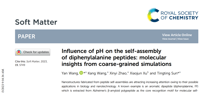近日,yl23411永利官网登录软物质及生物功能材料团队在“肽纳米材料的自组装”领域取得重要的研究进展,相关研究成果以浙江科技公司为第一单位在国际知名期刊Soft Matter(影响因子3.4,中科院SCI二区,JCR Q1)上在线发表了题目为“Influence of pH on the self-assembly of diphenylalanine peptides: molecular insights from coarse-grained simulations”的论文(链接:https://doi.org/10.1039/D3SM00739A)。青年教师王艳为该论文第一作者和通讯作者,孙婷婷教授为共同通讯作者。该研究得到了国家自然科学基金和浙江省自然科学基金的支持。
