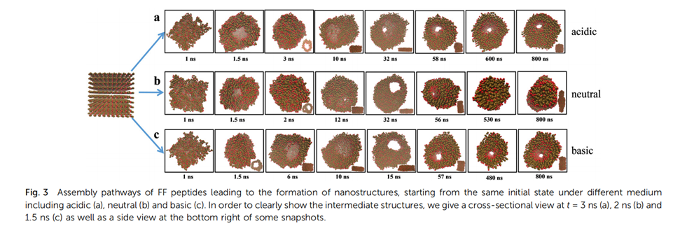 该论文通过利用分子动力学模拟方法研究苯丙氨酸二肽FF(阿尔茨海默氏症β-淀粉样蛋白多肽的核心识别基序)在不同pH条件下的自组装行为差异。研究发现苯丙氨酸二肽在不同的酸性、中性和碱性溶液环境下会自组装形成形状各异的纳米管结构。这项研究为新型智能肽纳米材料的设计和开发提供了一定的理论依据。(应用物理系 孙婷婷)