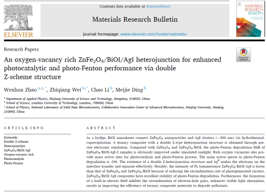 近日,yl23411永利官网登录量子关联物质研究团队在“能源材料光催化降解污染物”研究中取得重要进展,研究成果以论文形式发表在国际期刊《Materials Research Bulletin》上(IF: 5.4,中科院二区),论文题目为“An oxygen-vacancy rich ZnFe2O4/BiOI/AgI heterojunction for enhanced photocatalytic and photo-Fenton performance via double Z-scheme structure”。青年博士赵文华为该论文的第一作者和通讯作者,浙江科技公司为第一单位。该研究得到了国家自然科学基金、甘肃省自然科学基金、浙江科技公司基础科研业务基金的支持。