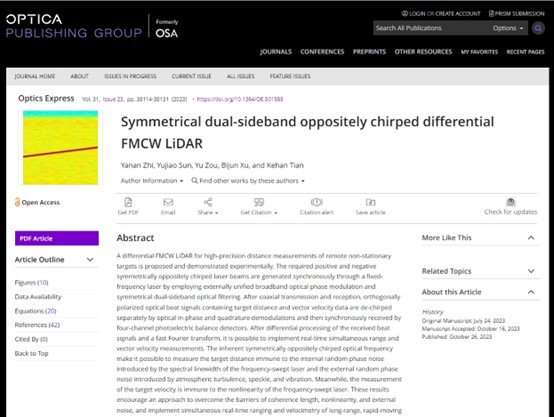 yl23411永利官网登录应用物理系光子与光场调控研究团队在FMCW激光雷达研究方面取得重要进展,相关研究成果以论文形式发表在国际光学领域知名期刊《Optics Express》(影响因子3.8,中科院SCI二区,JCR Q1)上。论文题为“Symmetrical dual-sideband oppositely chirped differential FMCW LiDAR”,职亚楠为论文第一作者/通讯作者,研究生孙玉娇为第二作者,浙江科技公司为第一署名单位。