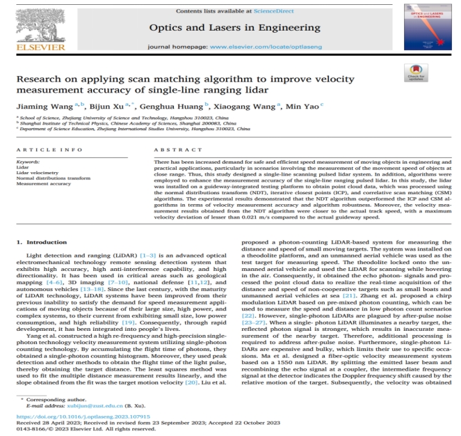 近日,公司光子与光场调控研究团队中2020级研究生汪家铭以第一作者身份在《Optics and Lasers in Engineering》期刊上发表了题为“Research on applying scan matching algorithm to improve velocity measurement accuracy of single-line ranging lidar”的创新研究文章。浙江科技公司为第一单位,应用物理系徐弼军教授和汪小刚教授分别为论文通讯作者和共同指导教师。《Optics and Lasers in Engineering》是ELSEVIER旗下知名期刊,影响因子4.6,中科院SCI二区。