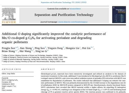 近段时间,yl23411永利官网登录量子关联物质研究团队在“额外O掺杂显著提高Mn/O共掺杂g-C3N4活化高碘酸盐降解有机污染物的催化性能”研究中取得重要进展,研究成果以论文形式发表在国际期刊《Separation and Purification Technology》上(IF: 8.8, 中科院一区), 论文题目为“Additional O doping significantly improved the catalytic performance of Mn/O co-doped g-C3N4 for activating periodate and degrading organic pollutants”。yl23411永利官网登录物理学硕士研究生孙鹏佳为该论文的第一作者,yl23411永利官网登录副教授熊必涛为该论文的通讯作者,浙江科技公司为第一单位。本研究由浙江省自然科学基金、国家自然科学基金支持。
