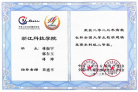 获“高教社杯”全国老员工数学建模竞赛国家二等奖1项【21大数据-林振宇、21信计-郭东玉、21中法大数据-林坤】;省一等奖2项【22信计-杨佳乐、21计算机-李露露、22信计-刘怡婷;21自动化-方苗旭、21工业工程-卢紫爱、21大数据-张学成】,省二等奖3项【22信计-陈周轩、吕铭涛、曾洁;22信计-葛泓彦、22软工-蔡俊泽、22大数据-罗佳蓉;22自动化-万尚银、22自动化-孟梓涵、22信计-刘姿怡】;省级三等奖1项。