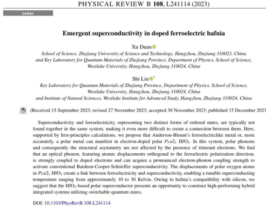 近日,公司量子关联物质研究团队的段旭博士在国际著名物理学术期刊Physical Review B上在线发表了题为“Emergent superconductivity in doped ferroelectric hafnia”的论文[Phys. Rev. B 108, L241114(2023)]。 浙江科技大学为第一单位,青年教师段旭为第一作者,西湖大学刘仕教授为通讯作者。该研究得到了国家自然科学基金的支持。