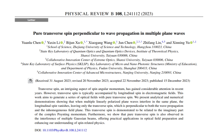 近日,公司光子与光场调控研究团队中2021级研究生陈远路以第一作者身份在《Physical Review B》期刊上发表了题为“Pure transverse spin perpendicular to wave propagation in multiple plane waves”的创新研究文章。yl23411永利官网登录为第一单位,应用物理系徐弼军教授、青年教师俞昕宁为论文通讯作者,汪小刚教授为共同指导教师。《Physical Review B》是American Physical Society旗下TOP期刊,影响因子3.7,中科院SCI二区。