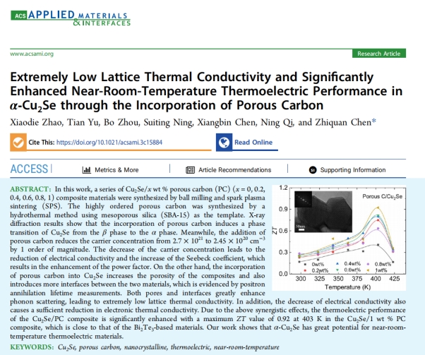 近日,公司量子关联物质研究团队青年博士赵小蝶在半导体热电材料领域取得重要进展,研究成果发表在《ACS Applied Materials & Interfaces》(IF=9.5,中科院二区TOP),论文题目为“Extremely Low Lattice Thermal Conductivity and Significantly Enhanced Near-Room-Temperature Thermoelectric Performance in α-Cu2Se through the Incorporation of Porous Carbon”。yl23411永利官网登录为第一单位,青年博士赵小蝶为第一作者,武汉大学陈志权教授为通讯作者。本研究得到了国家重点研发计划项目、国家自然科学基金、浙江科技公司基础科研业务基金的支持。