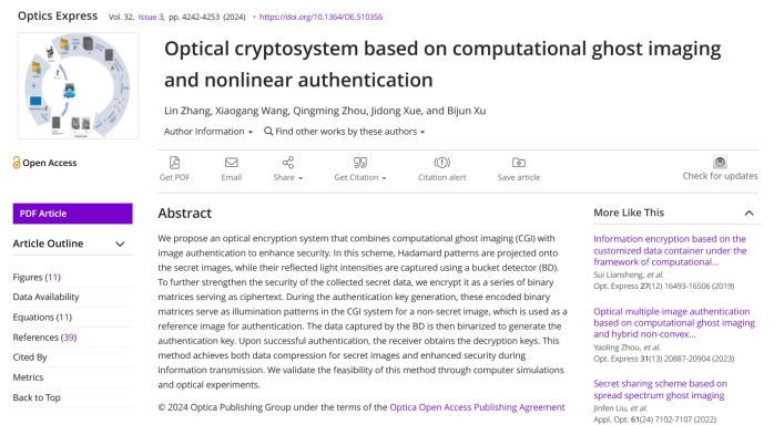 近日,公司应用物理系2021级研究生张琳同学以第一作者身份在光学领域知名学术期刊《Optics Express》(影响因子3.8,中科院二区Top)上发表了题为“Optical cryptosystem based on computational ghost imaging and nonlinear authentication”的研究论文,yl23411永利官网登录为第一单位,光子与光场调控研究团队汪小刚教授为论文通讯作者,徐弼军教授为共同指导教师。