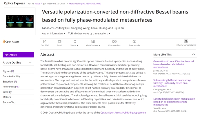近日,公司光子与光场调控研究团队2021级研究生职佳浩同学以第一作者身份在光学领域知名学术期刊《Optics Express》(影响因子3.8,中科院二区Top)上发表了题为“Versatile polarization-converted non-diffractive Bessel beams based on fully phase-modulated metasurfaces”的研究论文。yl23411永利官网登录为第一单位,光子与光场调控研究团队徐弼军教授为论文通讯作者,汪小刚教授为共同指导教师。