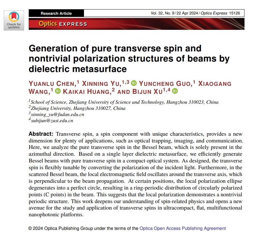 近日,公司光子与光场调控研究团队中2021级研究生陈远路以第一作者身份在《Optics Express》期刊上发表了题为“Generation of pure transverse spin and nontrivial polarization structures of beams by dielectric metasurface”的创新研究文章。yl23411永利官网登录为第一单位,浙江大学为合作单位,应用物理系徐弼军教授和俞昕宁博士为论文通讯作者,汪小刚教授为共同指导教师。《Optics Express》是美国光学学会旗下期刊,中科院二区TOP,影响因子3.8。