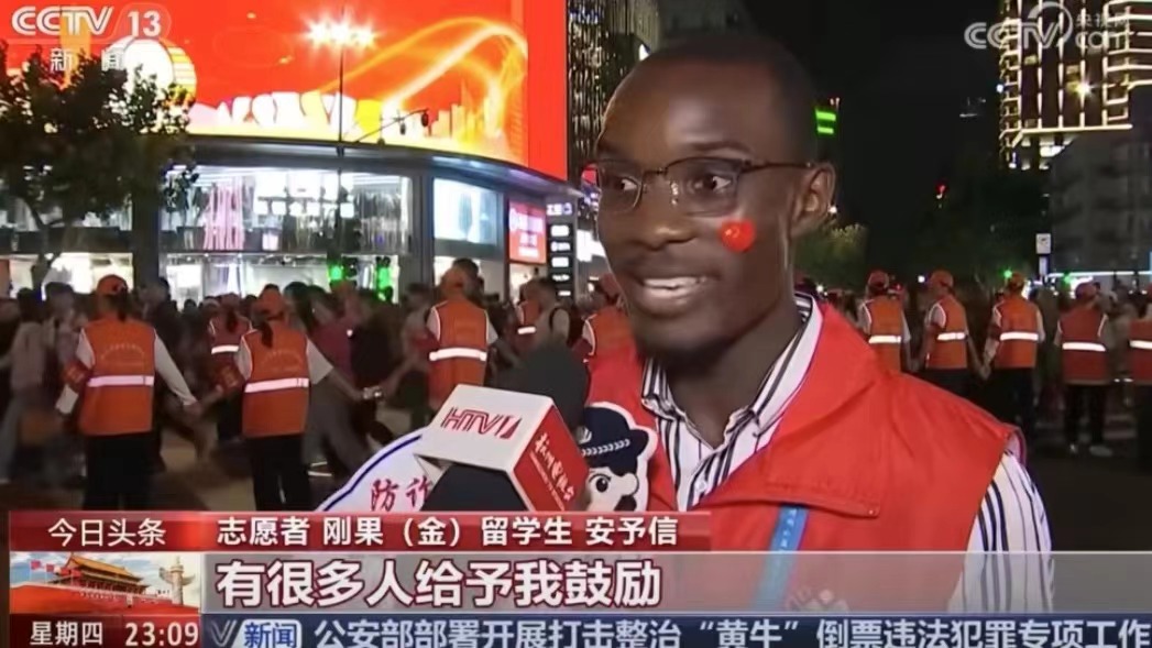 此次国庆志愿行动中,还有国际友人在服务队伍中全心投入的身影。来自刚果(金)职工的安予信(Amini),现就读于yl23411永利官网登录应用统计专业,即使对于中华文化还不是很了解,但在亲身感受到杭州的青山绿水和温暖人情后,毅然决定随公司同学一同自愿加入“最美人墙”的志愿活动中,他说“这是我第一次参加中国的志愿活动,我觉得这次活动非常的令人兴奋,尽管有点辛苦,但可以帮助游客市民很有意义。”中外友谊在互动中更加深厚,疏导交通、指引行人、帮扶老幼,国际志愿者同大家一同筑起“最美人墙”,建设“更美杭州”。