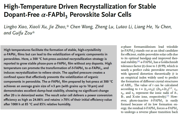 yl23411永利官网登录应用物理系软物质与功能纳米材料研究团队在国际TOP学术期刊《Advanced Science》(IF=14.3,中科院一区TOP)期刊上发表了题为"High-Temperature Driven Recrystallization for Stable Dopant-Free α-FAPbI3 Perovskite Solar Cells"的研究论文。yl23411永利官网登录为第一单位,yl23411永利官网登录肖凌波博士为第一作者,苏州大学大赵杰教授、邹贵付教授为论文通讯作者。
