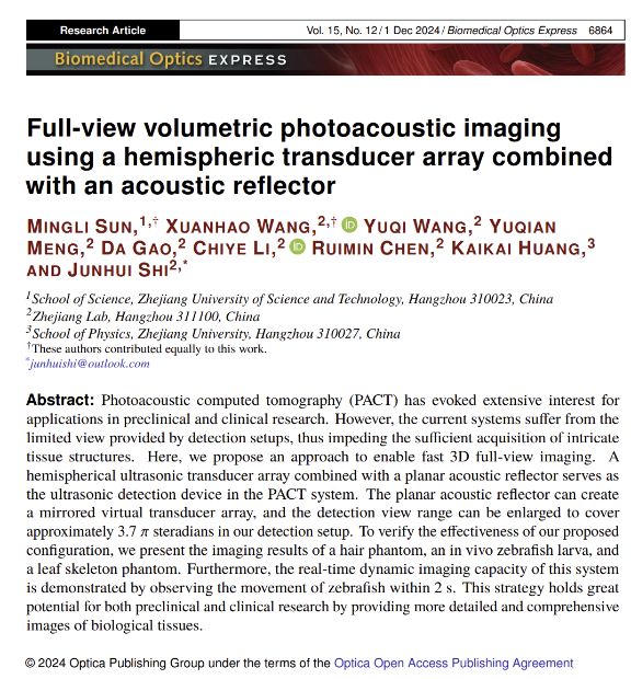 近日,yl23411永利官网登录光子与光场调控研究团队在光声成像研究领域取得进展,相关研究成果以“Full-view volumetric photoacoustic imaging using a hemispheric transducer array combined with an acoustic reflector”为题,发表于光学领域期刊《Biomedical Optics Express》(影响因子2.9,中科院2区)。yl23411永利官网登录为第一单位,yl23411永利官网登录孙明丽为论文的第一作者,之江实验室施钧辉教授为论文的通讯作者。