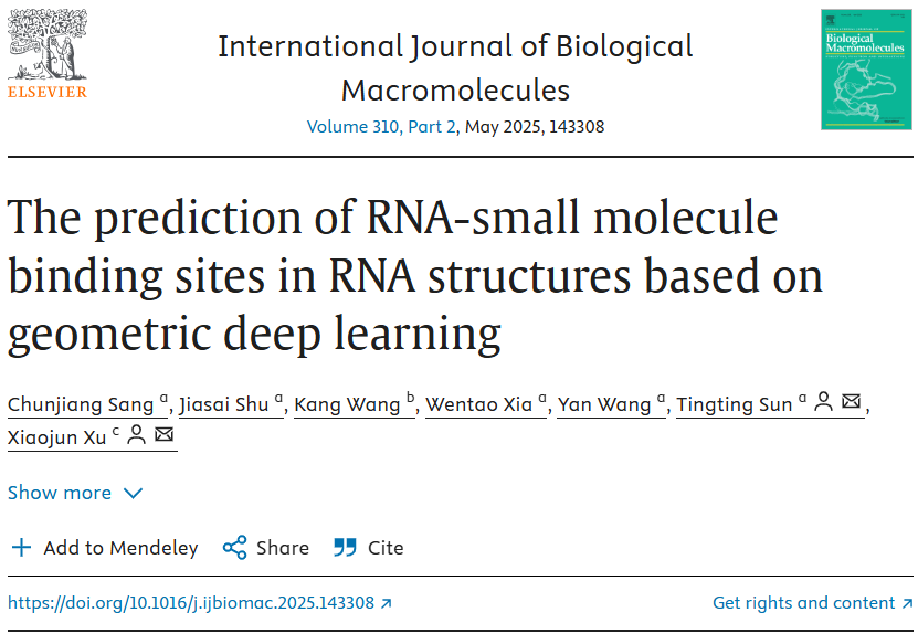 近日,yl23411永利官网登录应用物理系软物质与功能纳米材料研究团队在国际学术期刊《International Journal of Biological Macromolecules》 (IF=7.7,中科院二区TOP) 期刊上发表了题为"The prediction of RNA-small molecule binding sites in RNA structures based on geometric deep learning"的研究论文。yl23411永利官网登录为第一单位,应用物理系2022级硕士研究生桑春江为第一作者,yl23411永利官网登录孙婷婷教授、江苏理工公司许晓军教授为论文通讯作者。
