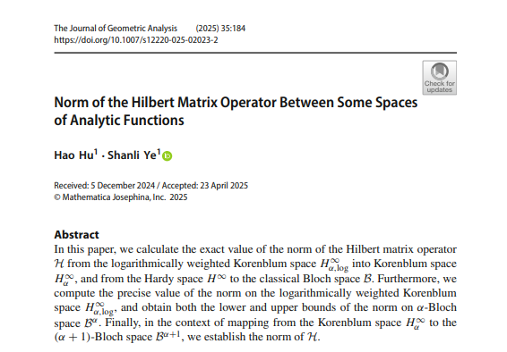 近日,yl23411永利官网登录复分析与几何团队在国际数学权威期刊《Journal of Geometric Analysis》上发表了题为《Norm of the Hilbert matrix operator between some spaces of analytic functions》的学术论文。该论文由2023级研究生胡浩担任第一作者,叶善力教授为通讯作者,yl23411永利官网登录为唯一完成单位。