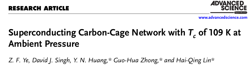 近日,yl23411永利官网登录物理系黄衣娜副教授团队联合浙江大学、密苏里大学、和中国科公司深圳先进技术研究所在国际顶级期刊《Advanced Science》(中科院一区,Top,影响因子14.3)上发表了题为“Superconducting Carbon-Cage Network with Tc of 109 K at Ambient Pressure”的研究论文。yl23411永利官网登录为第一单位,叶兆丰为论文第一作者,黄衣娜副教授,钟国华研究员,和林海青院士为通讯作者。此项研究获得国家自然科学基金和浙江省自然科学基金的资助。