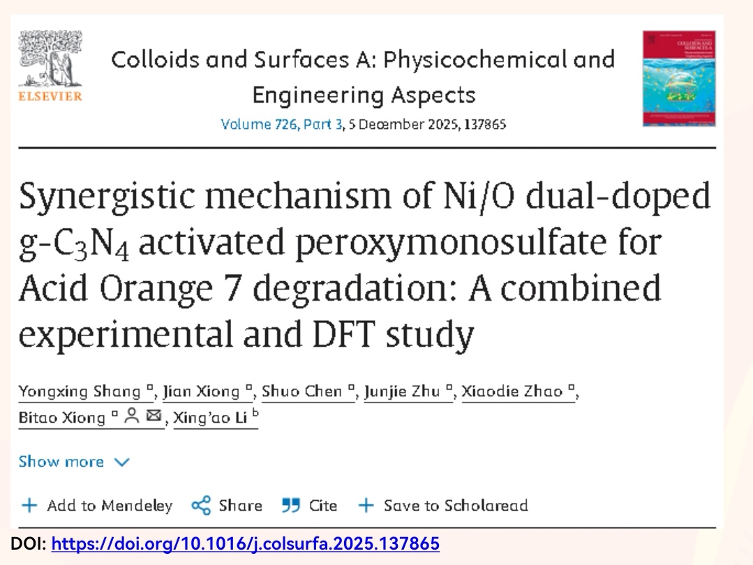 近日,公司应用物理2022级本科生商永兴以第一作者身份在《Colloids and Surfaces A: Physicochemical and Engineering Aspects》期刊上发表了题为“Synergistic mechanism of Ni/O dual-doped g-C3N4 activated peroxymonosulfate for Acid Orange 7 degradation: A combined experimental and DFT study”的科研文章。yl23411永利官网登录为第一署名单位,应用物理系熊必涛老师为论文通讯作者。《Colloids and Surfaces A: Physicochemical and Engineering Aspects》是ELSEVIER旗下中科院分区SCI二区期刊。