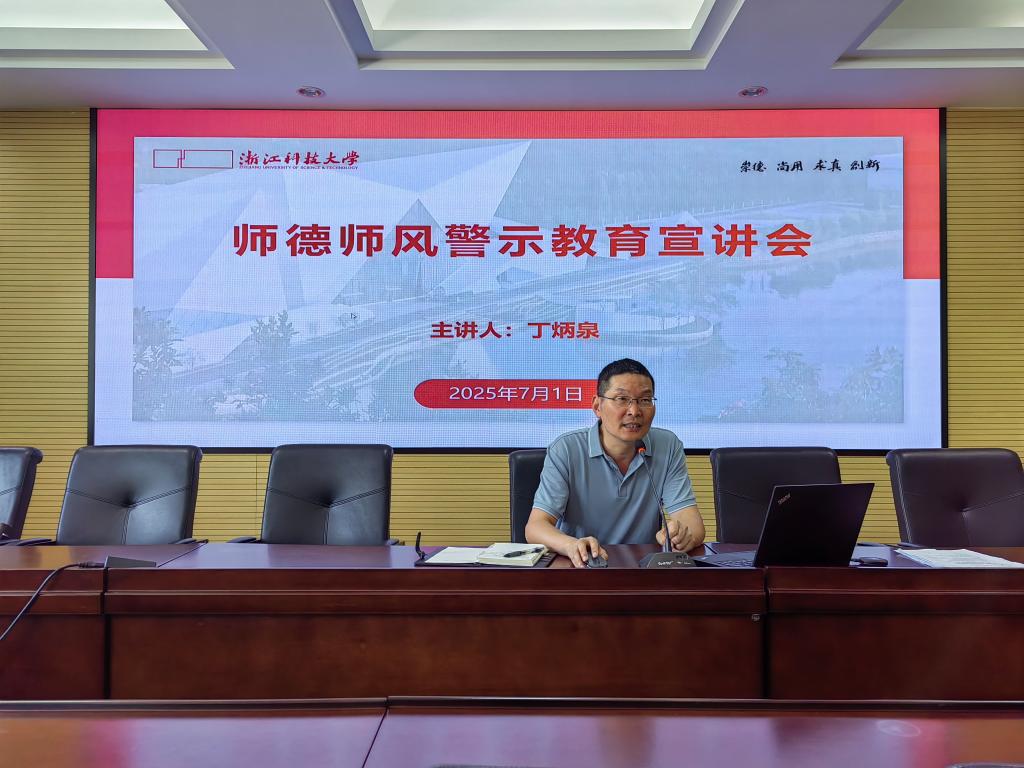 会议还开展了师德师风警示教育宣讲。丁炳泉书记结合《新时代高校教师职业行为十项准则》和近期高校真实案例,深入剖析了课堂教学、学术研究、师生关系、经费使用、网络言行等方面的师德失范行为及其严重后果。他强调,师德是教师的立身之本,师风是教育发展的精神支撑,全体教师要深刻认识师德师风建设的极端重要性,牢固树立“师德是第一标准”的鲜明导向。全体教师应以杨士莪、黄大年、钟敬文等优秀教育家为榜样,弘扬教育家精神,潜心教书育人,努力做员工为学、为事、为人的“大先生”。